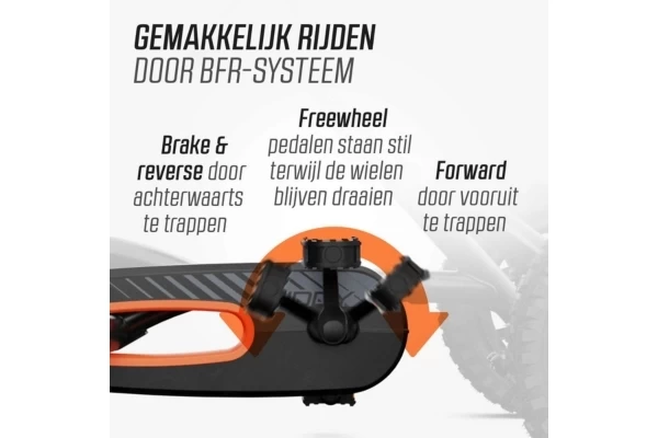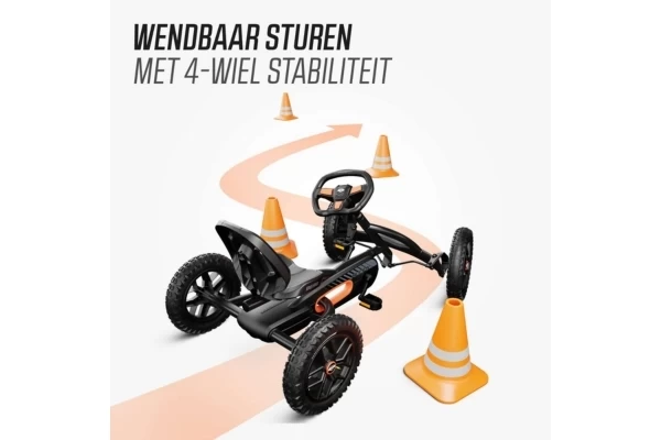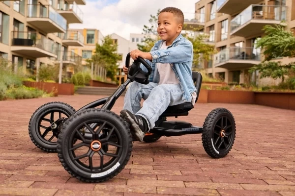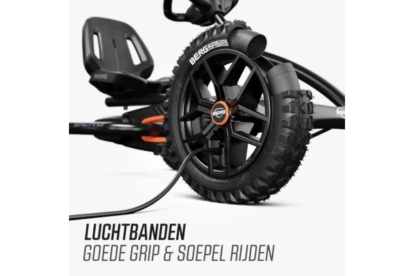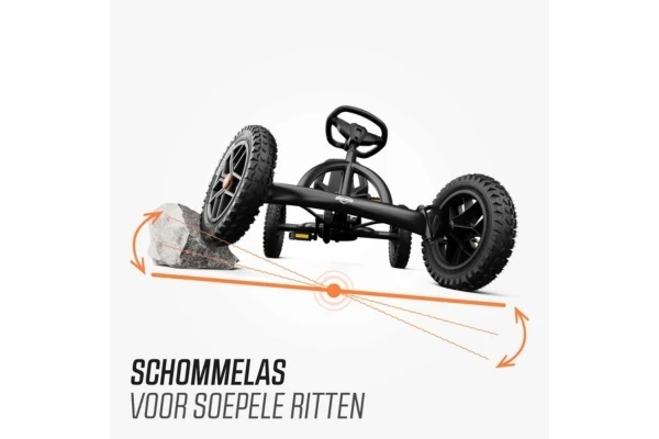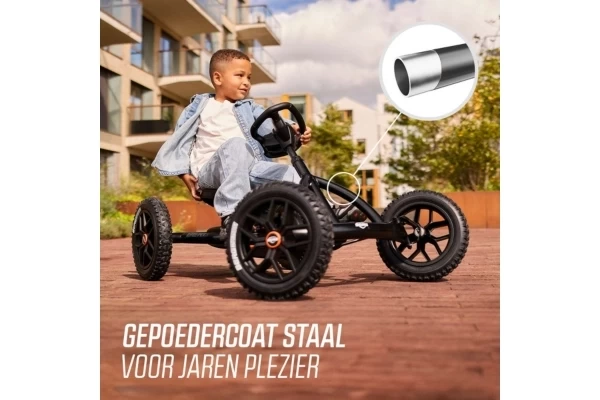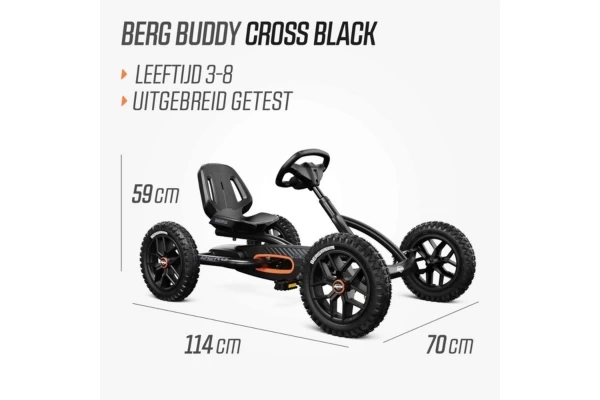 Ga op avontuur met de robuuste zwarte Buddy Cross Black! De skelter is voor stoere kinderen vanaf 3 jaar. Dankzij de verstelbare stoel groeit deze mee met een lichaamslengte van 100 tot 130 cm, zodat je kind er jarenlang plezier van heeft. De vier luchtbanden en de schommelas zorgen voor extra stabiliteit en comfort, ook op oneffen terrein. Met het slimme BFR-systeem kan de bestuurder trappen, remmen en direct achteruit rijden. Optioneel: breid de skelter dan uit met een leuke accessoire, zoals een aanhanger.