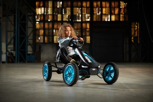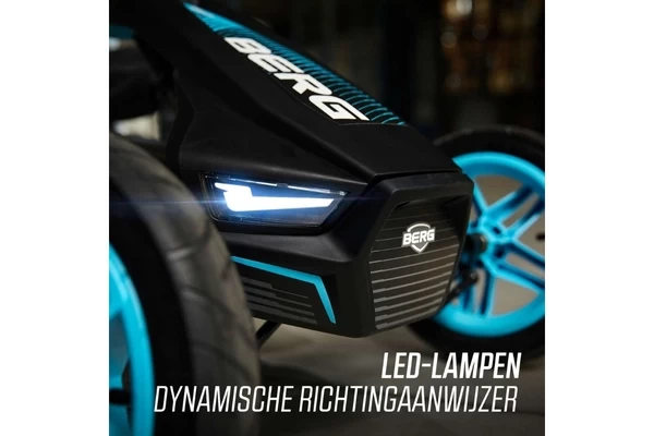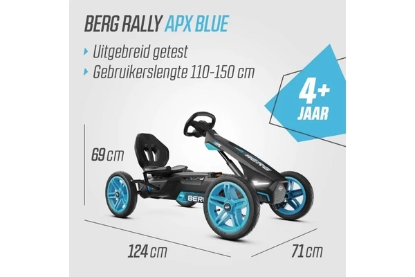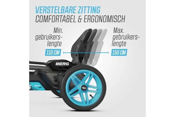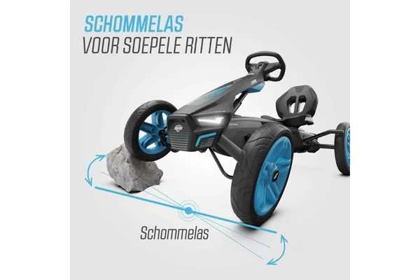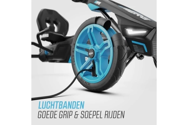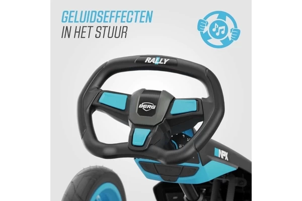 Een zwart/blauwe skelter met LED-lampen en richtingaanwijzers! De Rally heeft comfortabele luchtbanden, een schommelas en een BFR-systeem. Zowel de stoel als het stuur zijn verstelbaar waardoor de skelter meegroeit met kinderen van 4 tot 12 jaar (of een lichaamslengte van 110 tot 150 cm). Op het stuur zit een gave Soundbox met vier racegeluiden.
